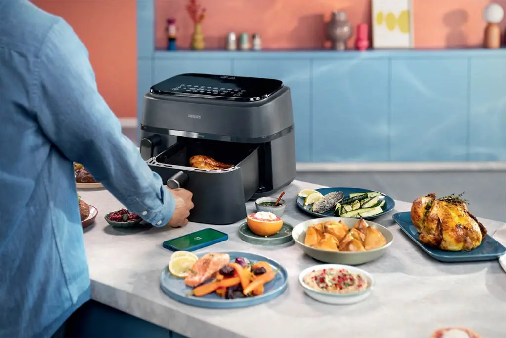 سرخ کن بدون روغن دوقلو مدل NA350 یکی از جدید ترین و متفاوت ترین سرخ کن های بی نظیر فیلیپس بوده که به تازگی تولید و روانه بازار شده است و می تواند راحتی و آسایش را برای پخت انواع غذا های سرخ کردنی به روش کاملاً سالم برای شما امکان پذیر کند. این دستگاه مناسب افرادی بوده که اهمیت زیادی به سبک زندگی سالم می دهند، چرا که می توانید با استفاده از سرخ کن دوقلو فیلیپس انواع غذا ها را بدون قطره ای روغن آماده کنید. سرخ کن بدون روغن فیلیپس مدل NA350 از سری 3000 سرخ کن های برند فیلیپس بوده که با برخورداری از قدرت 2750 وات به راحتی و در کم ترین زمان ممکن انواع غذا های خوش طعمی را برای شما آماده می کند. این سرخ کن دارای دو محفظه مجزا برای آشپزی بوده که این امکان را به شما می دهد تا به سرعت غذا های مختلفی را آماده کنید. همچنین سرخ کن 350 فیلیپس تا 70 درصد در مصرف انرژی صرفه جویی کرده و شما می توانید دو وعده غذایی مختلف را سریع تر از سایر وسیله ها بپزید. سرخ کن بدون روغن دوقلو فیلیپس NA350 دارای دو محفظه غیر هم اندازه با گنجایش های 6 لیتر و 3 لیتر بوده که نشان دهنده ظرفیت بالای دستگاه بوده که معادل 9 لیتر است و می تواند حداکثر 1.5 کیلوگرم غذا را برای شما آماده کند. البته لازم به ذکر است که بدانید کشوی کوچک دستگاه بیشتر مناسب برای سرخ کردن سیب زمینی، بادمجان و طبخ سبزیجات بوده و کشوی بزرگ برای مرغ شکم پر، کیک، ماهی، جوجه و … مناسب تر است. این سرخ کن دارای 8 برنامه از پیش تنظیم شده بوده که با انتخاب هر کدام می توانید دما و زمان مناسب را نیز مشاهده کنید، که به صورت خودکار تنظیم می شود. همچنین می توانید به صورت دستی زمان و دمای پخت را برای غذای های خود انتخاب کنید. کمپانی فیلیپس همیشه از بهترین ها در ساخت محصولات خود استفاده کرده است، و در طراحی محصولاتش همیشه شیک بودن را نیز در نظر می گیرد، به همین دلیل سرخ کن بدون روغن دوقلو NA350 دارای طراحی و ظاهر بسیار چشم گیر و جذابی می باشد. بدنه این دستگاه از جنس استیل و پلاستیک بسیار مقاوم و عایق سرد ساخته شده که با رنگ بسیار شیک مشکی، جلوه خاصی به آشپزخانه شما می بخشد. محفظه ها یا همان سبد های این سرخ کن نیز به شکل مربع و از جنس روکش نچسب ساخته شده اند و فاقد BPA می باشند. همچنین در بالای این دستگاه یک صفحه نمایشگر با دکمه های لمسی تعبیه شده که با استفاده از آن ها می توانید به راحتی تنظیمات مرتبط با پخت را انجام دهید.