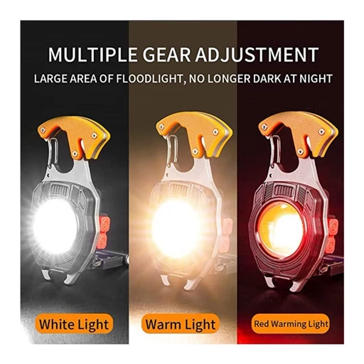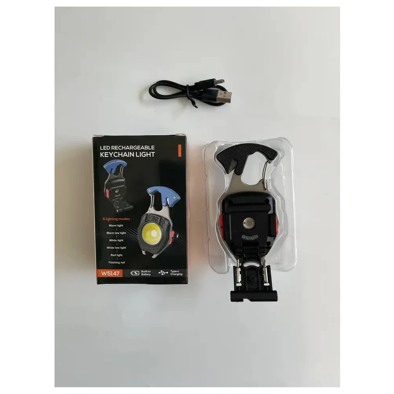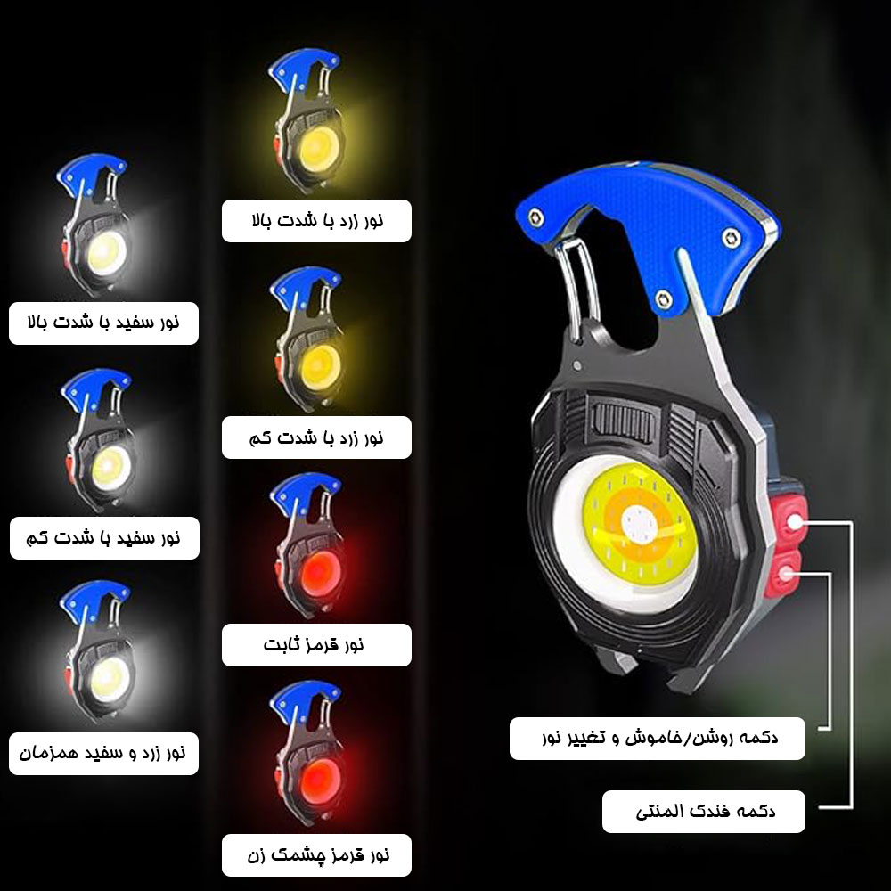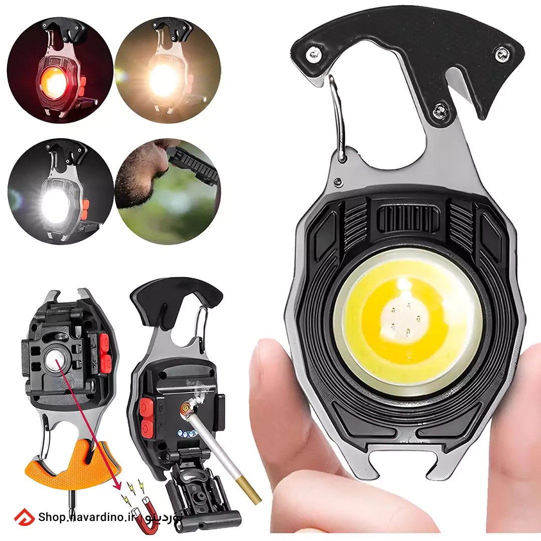 چراغ قوه جیبی چندکاره فندک دار مدل W5147 یک چراغ قوه کوچک با چند رنگ نور بسیار قوی است. در کنار قدرت نوری، قابلیتهای اضافه و کاربردی، این چراغ را متمایز میکند. این قابلیتها شامل فندک المنتی، پیچ گوشتی چهارسو و دو سو، سوت، کاتر طناب و بند، درب باز کن، آهنربا، گیرهی طرح کارابین و چراغ هشدار میشوند. عدسی این چراغ قوه جیبی، محدب و بصورت ذره بینی است و همین باعث میشود پخش نور بسیار خوبی داشته باشد. رنگ نورهای این چراغ شامل نور زرد، نور سفید و نور قرمز میشود که نور زرد و سفید با دو حالت کم نور و پر نور ، پخش نور را دارند و نور قرمز هم با دو حالت ثابت و چشمک زن قابل تنظیم است. برای داشتن نور بیشتر هم میتوان همزمان نور زرد و سفید را روشن کرد که در بخش راهنمای کار با چراغ قوه که در ادامه آمده است روش فعال کردن حالت نور 2برابر گفته شده است. با توجه به رنگ نوری که انتخاب میشود، با هر بار شارژ میتوان 1.5 الی 3 ساعت بطور مداوم از چراغ استفاده کرد. یک فندک المنتی روی بدنهی چراغ قوه جیبی چندکاره مدل W5147 طراحی شده است که فقط با باتری داخلی چراغ و بدون نیاز به گاز فندک و موارد مشابه کار میکند. این فندک برای روشن کردن سیگار کاربرد دارد و با نگهداشتن دکمهی فندک(دکمه کوچک تر) روشن، و بعد از چند ثانیه خاموش میشود. داخل بدنهی چراغ قوه جیبی چندکاره فندک دار مدل W5147، یک عدد پیچ گوشتی دو سو و یک عدد چهارسو مخفی شده است؛ با بازکردن درب پشتی فندک، میتوان این سریها را خارج کرد. برای استفاده از پیچ گوشتی، سریها را روی محفظهی مشخص شده در بالای دستهی چراغ قرار دهید. با چفت شدن سریها میتوان از چراغ به عنوان پیچ گوشتی استفاده کرد. ر کنار قسمت کارابین شکل یا همان گیرهی آویز چراغ، یک تیغهی کوچک طراحی شده است. این تیغه داخل بدنه جای داده شده است و خطری ندارد؛ اما میتوان با وارد کردن طناب و بند به محفظهی تیغه، آنها را برش داد یک مرتبه فشردن دکمه = نور سفید باشدت بالا دو مرتبه فشردن دکمه = نور سفید با شدت کم سه مرتبه فشردن دکمه = نور زرد باشدت بالا چهار مرتبه فشردن دکمه = نور زرد با شدت کم پنج مرتبه فشردن دکمه = نور قرمز بصورت ثابت شش مرتبه فشردن دکمه = نور قرمز با حالت فلش نگهداشتن دکمه بیشتر از دو ثانیه = (نور 2برابر)؛ نور سفید و زرد بصورت همزمان